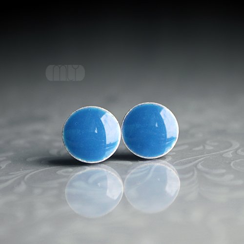 Ceramiczne lekko nieregularne kolczyki w formie sztyftów, ręcznie wykonane z delikatnej gliny kamionkowej, jednostronnie szkliwione błękitnym szkliwem, na antyalergicznych sztyftach w kolorze srebrnym.Średnica ok. 9mm. Polecam