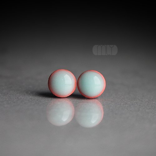 Efektowne kolczyki w formie sztyftów, ręcznie wykonane z delikatnej barwionej na różowo porcelany, jednostronnie szkliwione blado zielonym szkliwem, na antyalergicznych sztyftach w kolorze srebrnym.długość elementu ceramicznego ok 9mm, Polecam