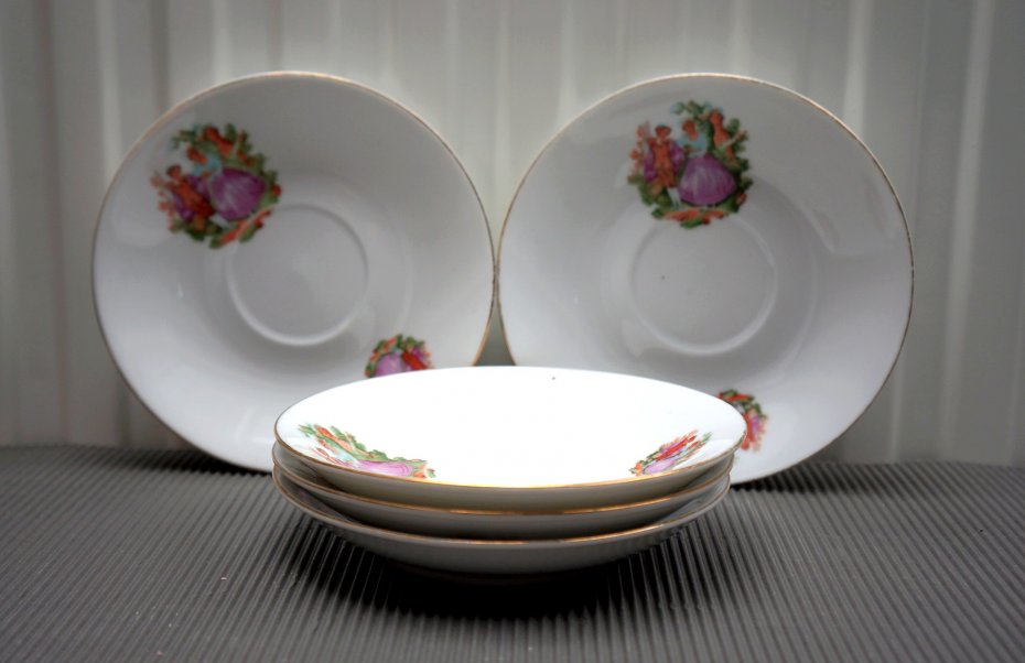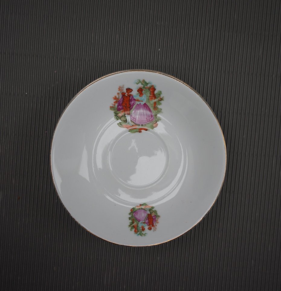 Małe talerzyki - podstawki /5 sztuk/ made in china. Biała porcelana w klasycznym kształcie, zdobiona złotymi liniami i scenką rodzajową.