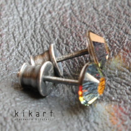 Srebrne maleńkie kolczyki z kryształkiem Swarovskiego w kolorze Volcano (średnica 6mm). Całość zwieńczona silikonowym barankiem. Srebro próby 925. Wszystkie elementy oksydowane i ręcznie polerowane. Serdecznie polecam.