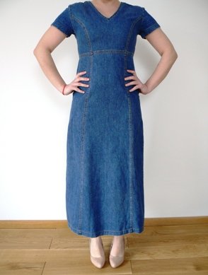 Uszyta z cienkiego dżinsu, ma prosty fason przypominający sukienki z lat 70. XX w.