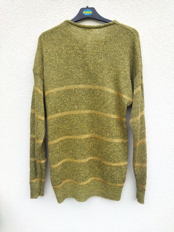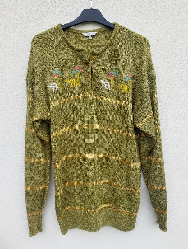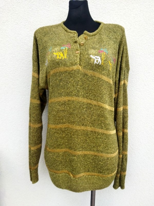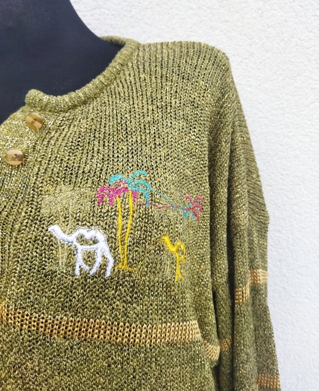 Wiskozowo- bawełniany sweter w kolorze groszkowej zieleni z wplecioną metaliczną złotą nitką w lureksowe paski w złocistym kolorze, u góry zdobiony haftowanymi wielbłądami i palmami. Zapinany u góry na guziczki . Wykończony sciagaczami .