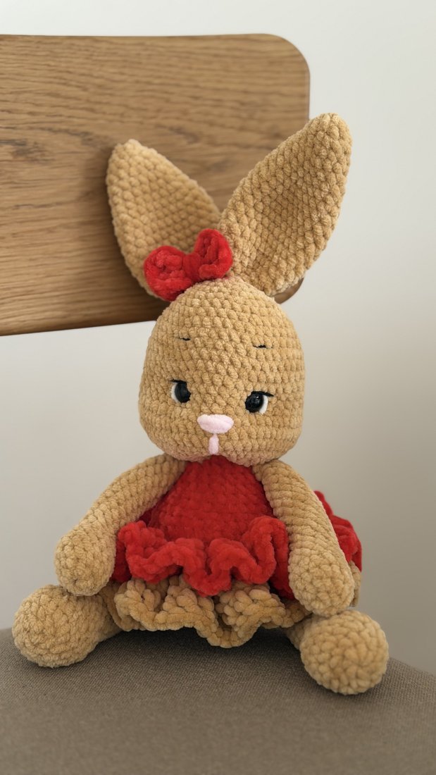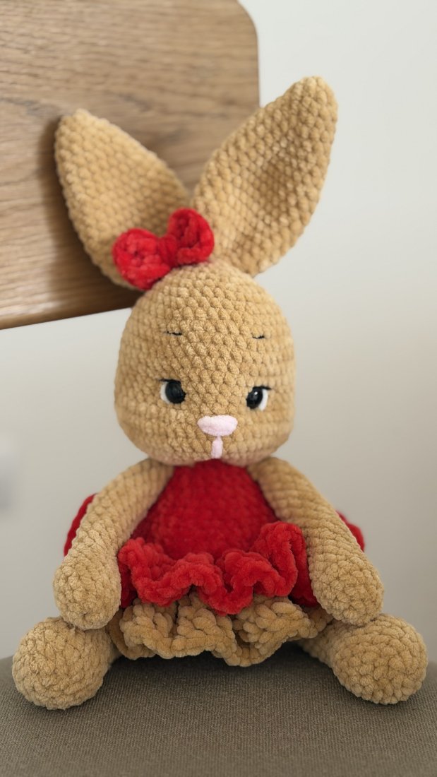 Ta urocza dama w czerwonej sukience skradnie serce od pierwszego spojrzenia. Ma długie uszka, delikatny różowy nosek i kokardkę, która dodaje jej dziewczęcego wdzięku. Idealna do przytulania, dekoracji pokoju dziecięcego lub jako wyjątkowy prezent na każdą okazję.