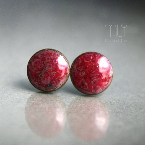 Oryginalne ceramiczne kolczyki w formie sztyftów, ręcznie wykonane z delikatnej gliny kamionkowej, jednostronnie szkliwione błyszczącym różowym szkliwem, na antyalergicznych sztyftach w kolorze srebrnym. Średnica ok 11mm