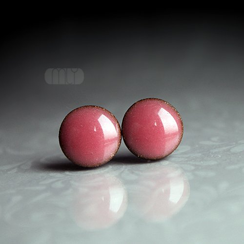 Oryginalne ceramiczne kolczyki w formie sztyftów, ręcznie wykonane z delikatnej gliny kamionkowej, jednostronnie szkliwione błyszczącym różowym szkliwem, na antyalergicznych sztyftach w kolorze srebrnym. Średnica ok 11mm