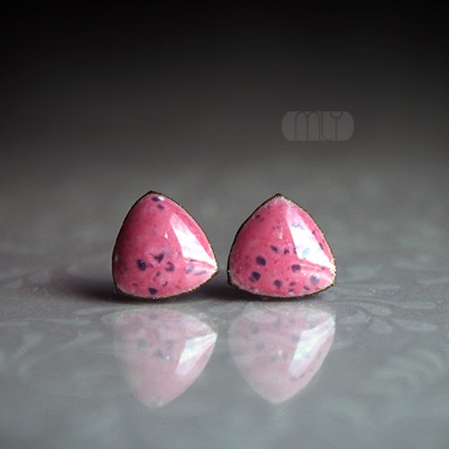 Ceramiczne kolczyki w formie sztyftów, ręcznie wykonane z delikatnej gliny kamionkowej, jednostronnie szkliwione mieszanką różowych szkliw z efektem plamek i subtelnym połyskiem, na antyalergicznych sztyftach w kolorze srebrnym.Średnica ok. 10mm.. Polecam