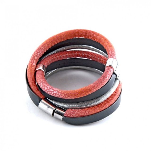 Malinowo- brzoskwiniowy kolor rzemyka ciekawie współgra z dyskretną szarością i srebrnym połyskiem.