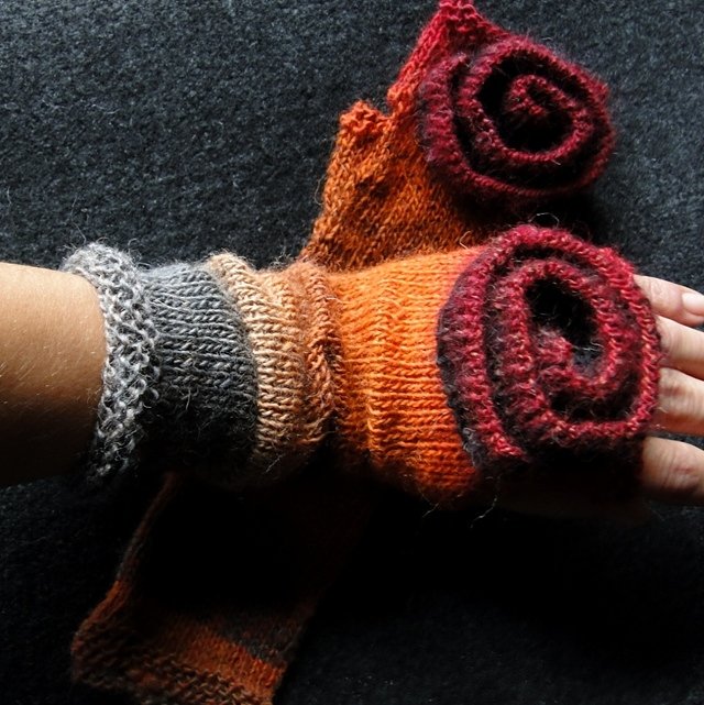 Ekstrawaganckie mitenki wykonane ręcznie z wysokiej jakości włóczki ( 75%wełna, 25% poliamid) w przepięknych odcieniach.. Ozdobione przestrzennym, geometrycznym w formie kwiatem. Miękkie i miłe w dotyku. Niebanalny dodatek i ochrona przed chłodem. Długość: ok. 29 cm. Wzór autorski. Polecam serdecznie.