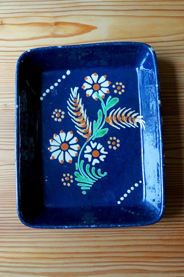 Gliniany, ciężki pojemnik vintage, malowany ręcznie w kwiaty na dnie i po bokach - szkliwiony.
