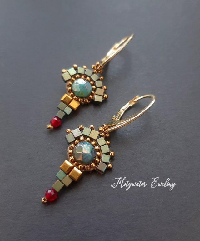Drobne kolczyki wiszące wykonane swoistą techniką haftu drobnymi koralikami szklanymi w połączeniu z granatem syntetycznym oraz hematytem platerowanym. Kolczyki dwustronne, podwieszone na biglach pozłacanych, satynowanych i nieuczulających typu angielskiego. Wykonane w pojedynczym egzemplarzu. Wymiary: długość wraz z zapięciem - 4 cm; szerokość - 1,6 cm.