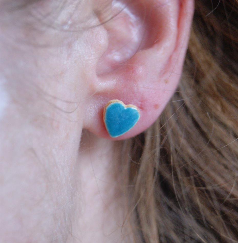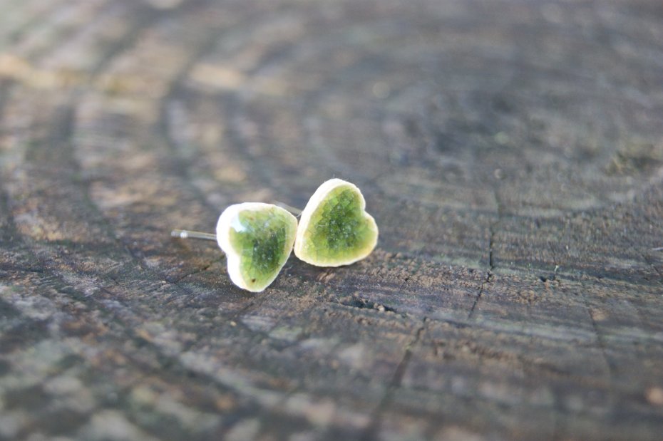 Śliczne małe ceramiczne kolczyki sztyfty w kształcie serduszek. Wykonane z lekkiej jasnej gliny pokryte niezwykłym zielonym błyszczącym szkliwem które nadaje im wyjątkowy wygląd.