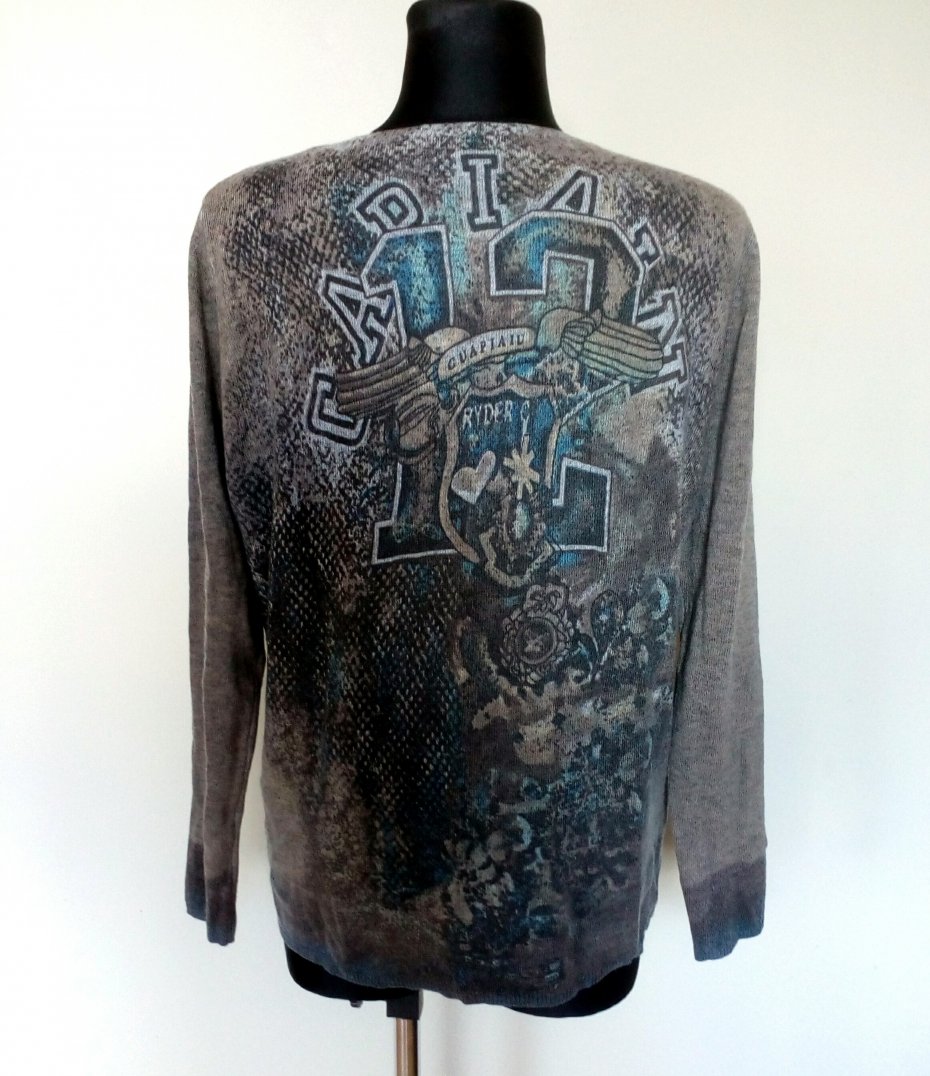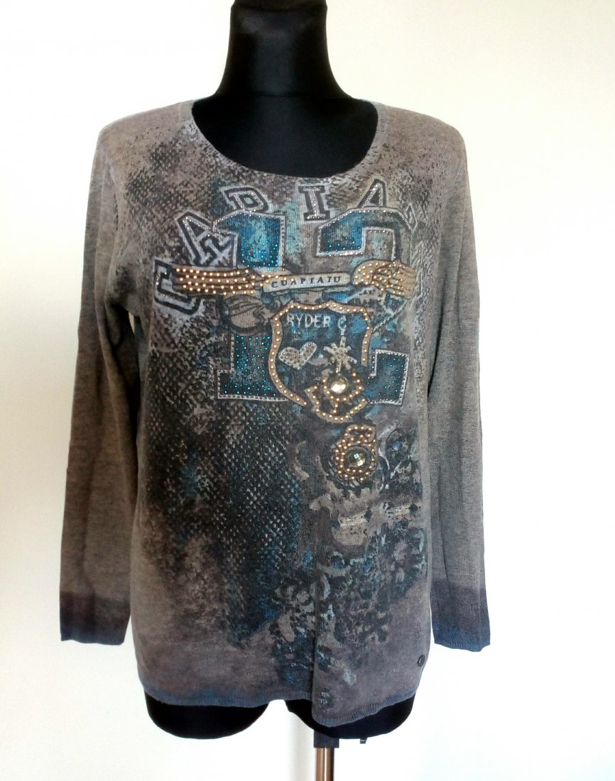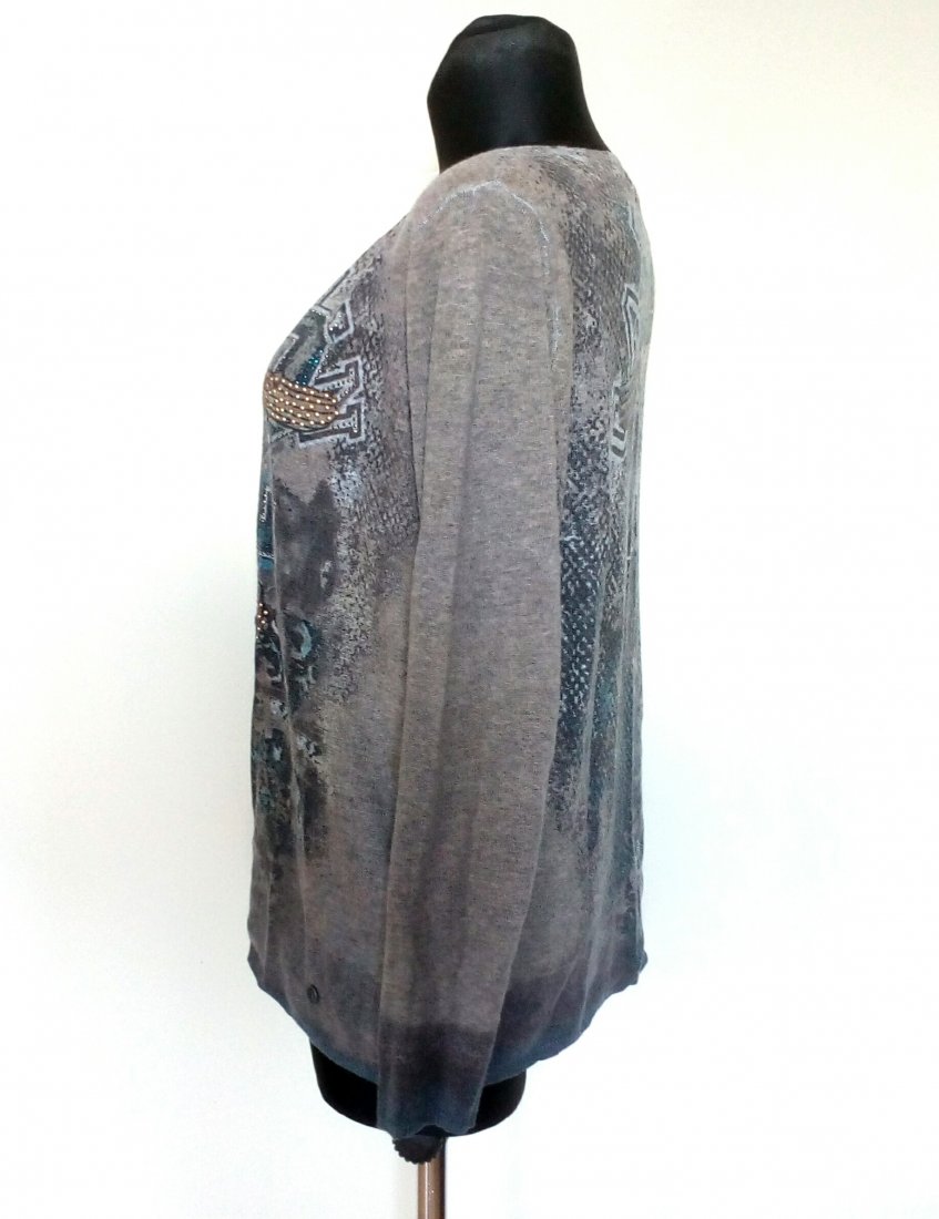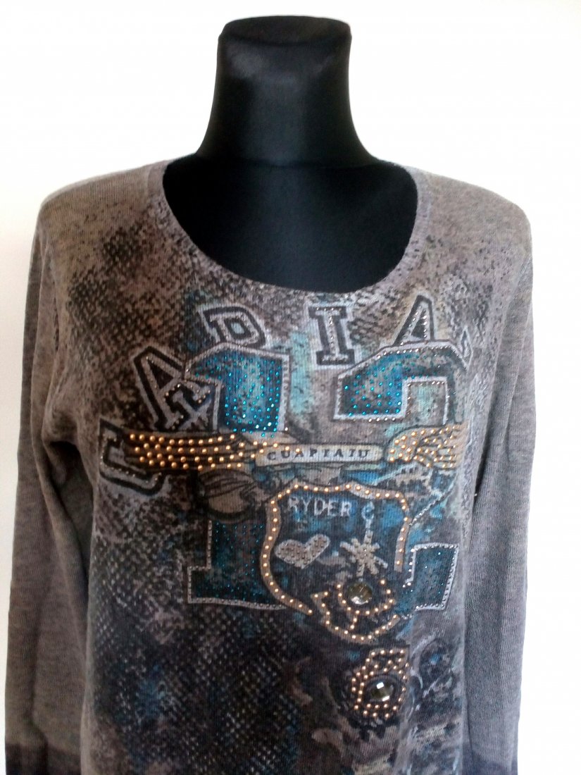 Cienki sweter z wzorami, przód zdobiony cyrkoniami i napami