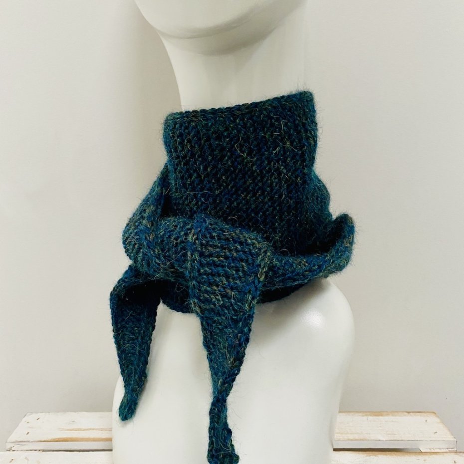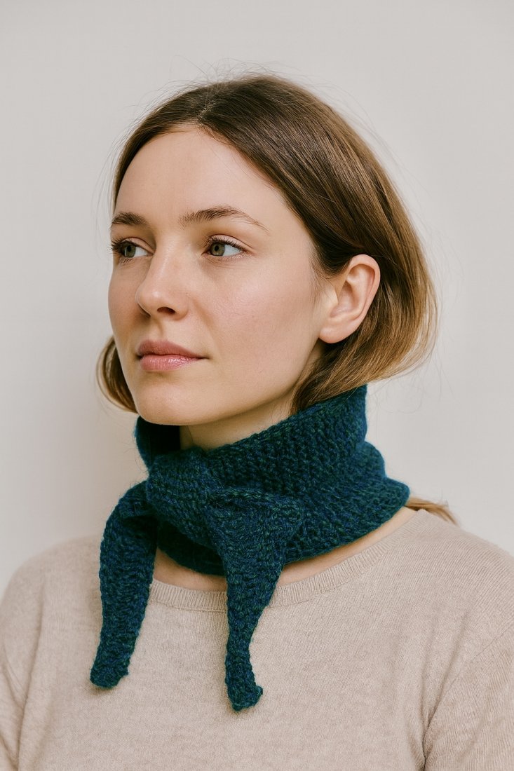 Mały szalik - apaszka wykonany w całości ręcznie na drutach z dwóch nitek wysokiej jakości miękkiej norweskiej włóczki 100% superfine alpaca, w kolorze petrol oraz leśnym zielonym. Alpaka jest włóknem nieprzetworzonym, co oznacza, że została tylko uprana oraz, że przed farbowaniem nie została poddana obróbce chemicznej.