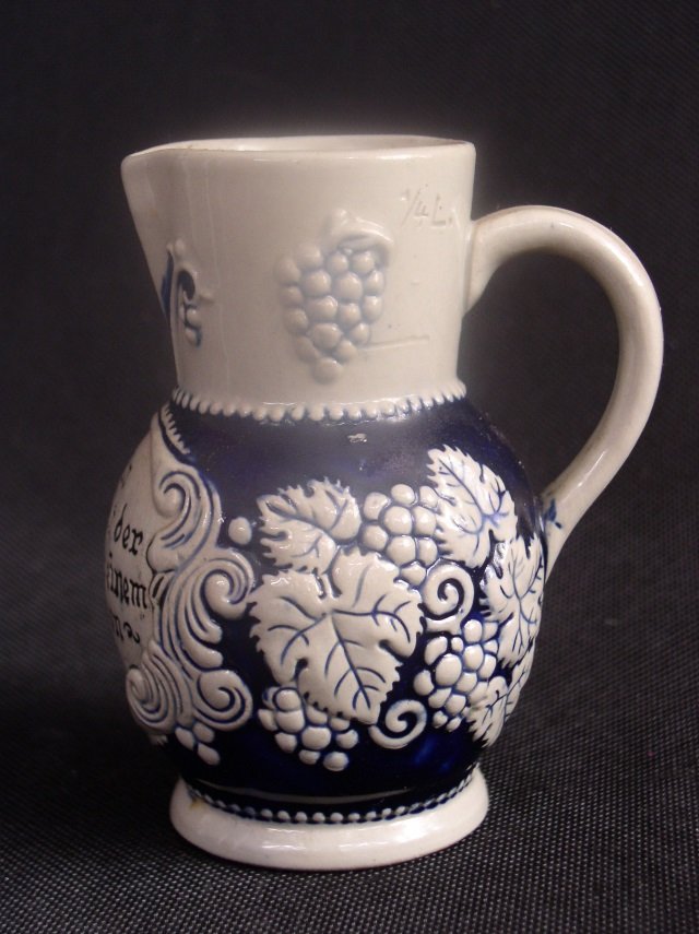 Mały dzbanek na wina 1/4 l z uchem do trzymania i dziubkiem..Wypukłe wzory winogron z liśćmi.Z przodu napis w języku niemieckim.Stan bardzo dobry.Wysokość 13 cm.Kolor szaro-granatowy.