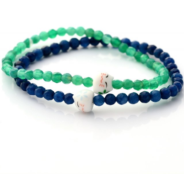 Minimalistyczna, delikatna, zabawna i urocza bransoletka wykonana z malutkich fasetowanych agatów w kolorze zielonym (3mm) oraz małego chińskiego kotka szczęścia.