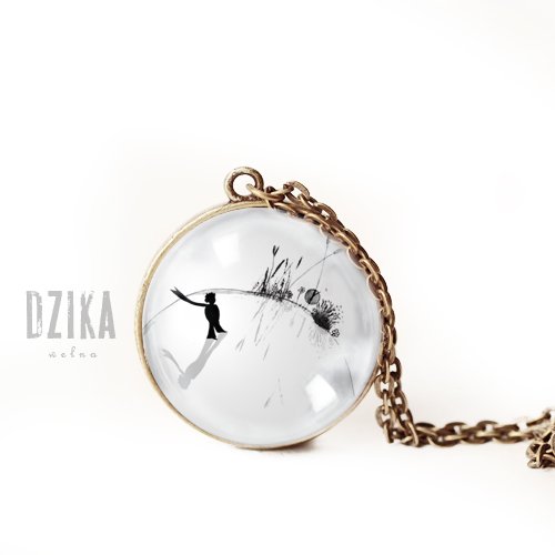 Autorska grafika ukryta pod 30 cm szkiełkiem. Baza w kolorze antycznego złota z tyłu ozdobiona drzewem. Srednica medalionu 3,2 cm, medalion zawieszony jest na długim na 80 cm. łańcuszku.