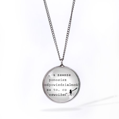 Na zawsze ponosisz odpowiedzialność za to co oswoiłeś. Antoine de Saint-Exupéry Autorska grafika ukryta pod 20 mm szkiełkiem , baza naszyjnika w kolorze ciemnego srebra, łańcuszek 48 cm.