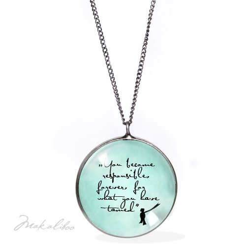 sympatyczny miętowy naszyjnik, z kolekcji Mały Książę. Napis ukryty pod szkiełkiem 25 mm. Baza w kolorze ciemnego srebra. łańcuszek 48 cm. Stajesz się na zawsze odpowiedzialny, za to co oswoiłeś. (wersja angielska) Antoine de Saint-Exupéry Projekt autorski. Wszystkie prawa zastrzeżone.