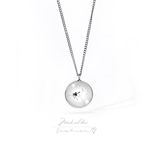 Autorska grafika ukryta pod 16 mm szkiełkiem , baza naszyjnika w kolorze ciemnego srebra, łańcuszek 48 cm.