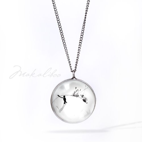 Autorska grafika ukryta pod 20 mm szkiełkiem , baza naszyjnika w kolorze ciemnego srebra, łańcuszek 48 cm.