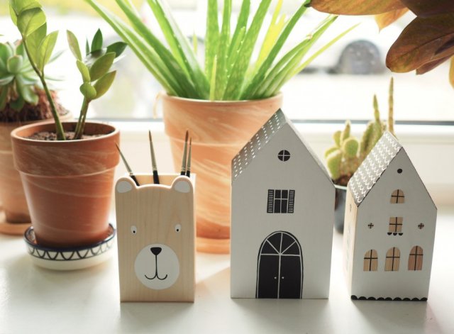 Pojemnik na kredki, wykonany z drewna, pomalowany farbami akrylowymi. Całość pokryta lakierem bezbarwnym.