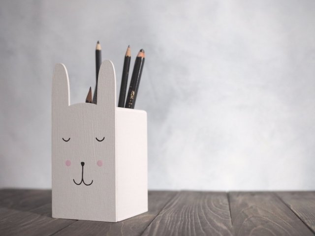 Pojemnik na kredki lub inne przybory artystyczne, wykonane z drewna, pomalowane farbami akrylowymi. Wymiary zewnętrzne 7,5 x 7,5 cm, wysokość całkowita razem z uszami: 16,5 cm.