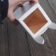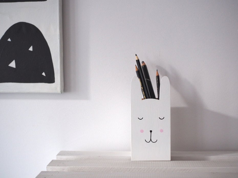 Pojemnik na kredki lub inne przybory artystyczne, wykonane z drewna, pomalowane farbami akrylowymi. Wymiary zewnętrzne 7,5 x 7,5 cm, wysokość całkowita razem z uszami: 16,5 cm.