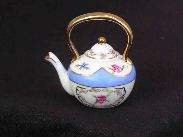 Przeuroczy imbryczek herbaciany w miniaturowym wydaniu - edycja kolekcjonerska ze szlachetnej leciutkiej porcelany. Kwiatowe zdobienie i złocenia. Piękna forma, zwłaszcza to złote ucho :) 8,5 x 7 x 8,5 cm. Stan zachowania bardzo dobry. Sygnowany Regal. Świetny do kolekcji. - dekoracyj - nie użytkowy.