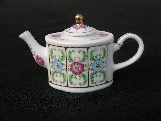 Przeuroczy imbryczek herbaciany w miniaturowym wydaniu - edycja kolekcjonerska ze szlachetnej leciutkiej porcelany. Proste graficzne zdobienie - w sam raz :) Wyjątkowo uroczy. Precyzja wykonania; złocenia. 11,5 x 4,5 x 6,5 cm. Stan zachowania bardzo dobry. W oryginalnym opakowaniu zabezpieczającym i z metką. Sygnowany Porcelain Art. Skarb do kolekcji !