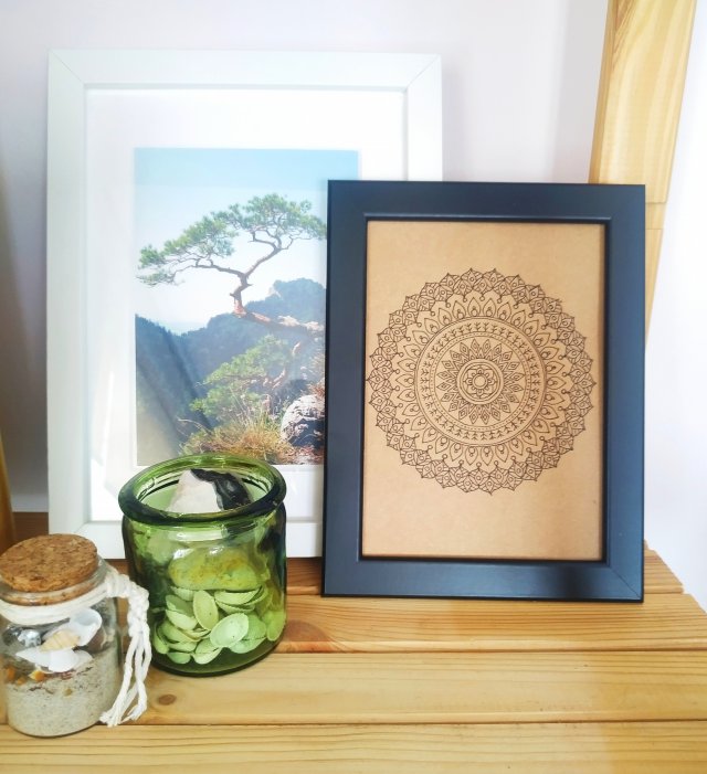 Całość oprawiona w czarną ramkę. Oryginalna ozdoba na ścianę lub na półkę w stylu boho.