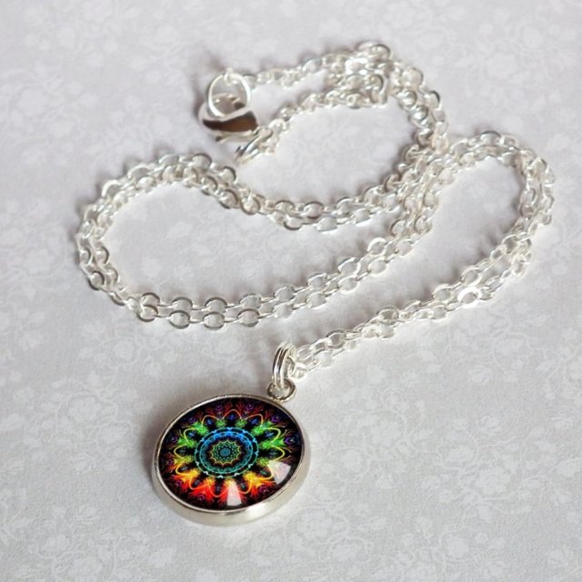 Subtelny, ręcznie wykonany naszyjnik z oryginalną grafiką artystyczną, zatopioną pod wypukłym szkiełkiem dającym efekt głębi, w oprawie w kolorze srebra. Wisiorek zawieszony na delikatnym, eleganckim łańcuszku z zapięciem w kolorze srebra. Grafika jest najwyższej jakości, wyraźna i nasycona, wywołana na wysokiej klasy papierze fotograficznym. Biżuteria hipoalergiczna.
