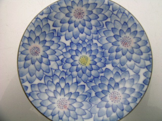 Porcelanowy niewielki Talerzyk - miseczka Niesygnowany,ale wielce szlachetny; Biała porcelana u fantastyczne zdobienie mandaliicznych kwiatów stupłatki i kolorem podkreślone kwiatów środki.Niuanse niebieskości,błyszczące wykończenie i ciemno muśnięty rant.
