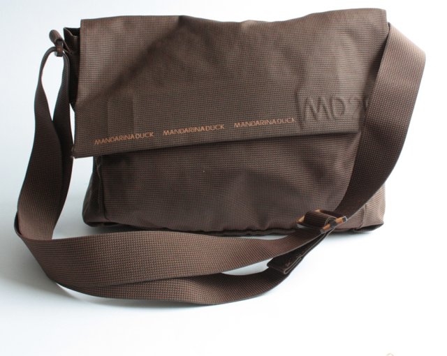 Pojemna torba z wieloma przegródkami, na długim pasku o regulowanej długości, włoskiej marki specjalizującej się w torbach i walizkach Mandarina Duck. Torba jest od wewnątrz impregnowana, prawdopodobnie wodoodporna.
