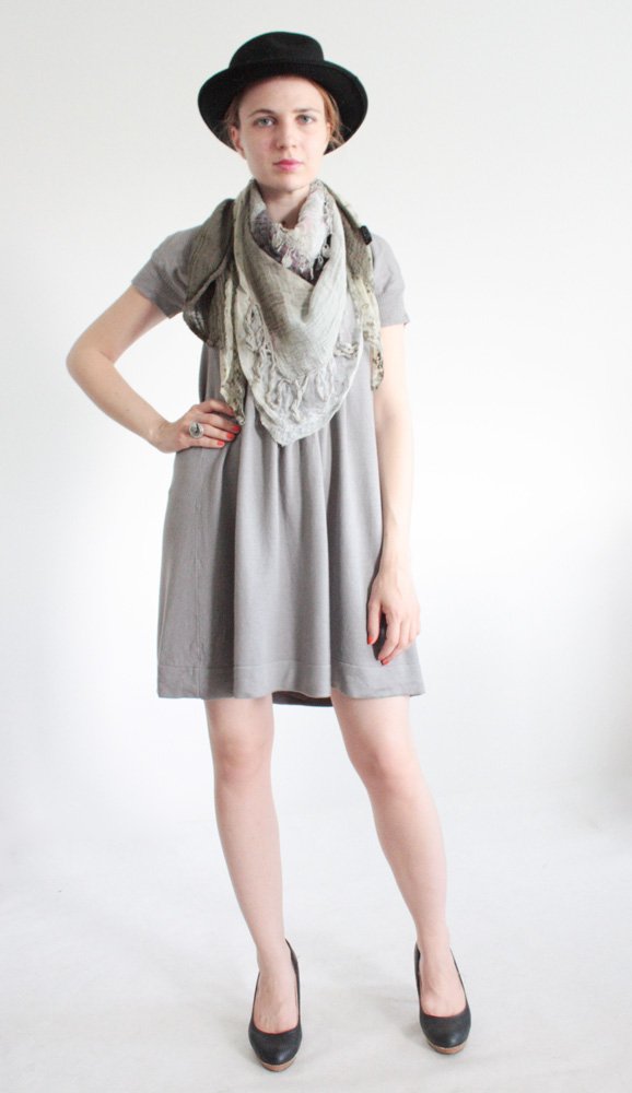 Szara, klasyczna sukienka luksusowej duńskiej marki MANESTRALE. Wykonana z czystej, miękkiej, cienkiej wełny. Odpowiednia również na lato.