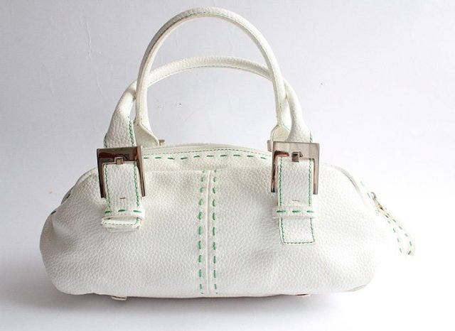 Biała torba z oryginalnymi przeszyciami, wykonana prawdopodobnie ze skóry ekologicznej.