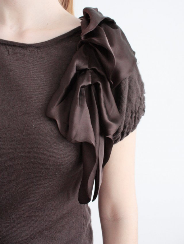 Czekoladowo-brązowa bluzeczka z ciekawymi asymetrycznymi detalami wykonanymi w mojej ocenie z jedwabiu.