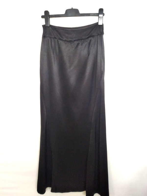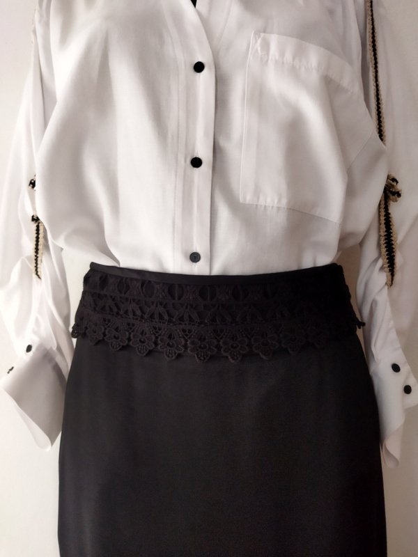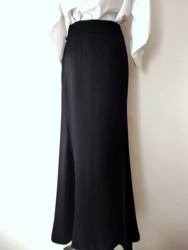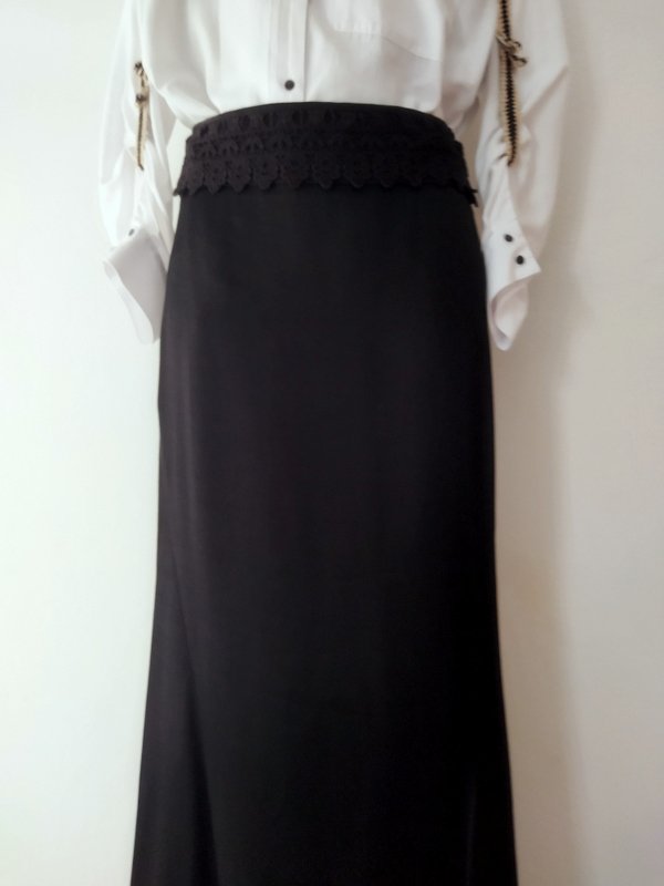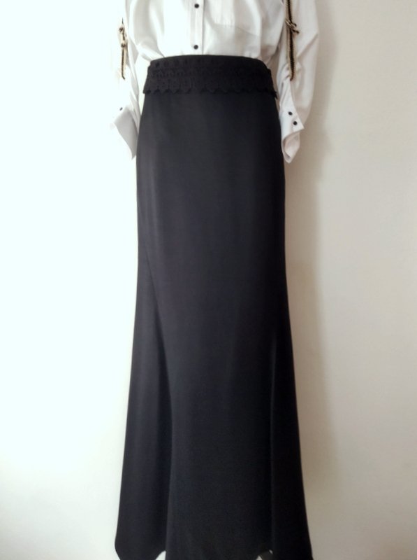Elegancka spódnica maxi z grubszej wiskozowej tkaniny w czarnym kolorze z lekkim satynowym połyskiem, z przodu w pasie gipiurowa koronka. Dopasowana w biodrach o kształcie syrenki - rozkloszowana od kolan wszywanymi godetami. Zapinana z boku na zamek. Na podszewce.