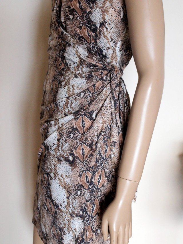 śliczna sukienka w wężowy wzór marki Mango. bardzo ładnie drapowana, góra usztywniona fiszbinami. pod spodem podszewka, z boku zamek. Stan bardzo dobry. rozmiar z metki XL. Podaję wymiary mierzone na płasko;