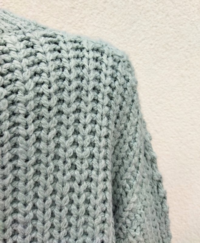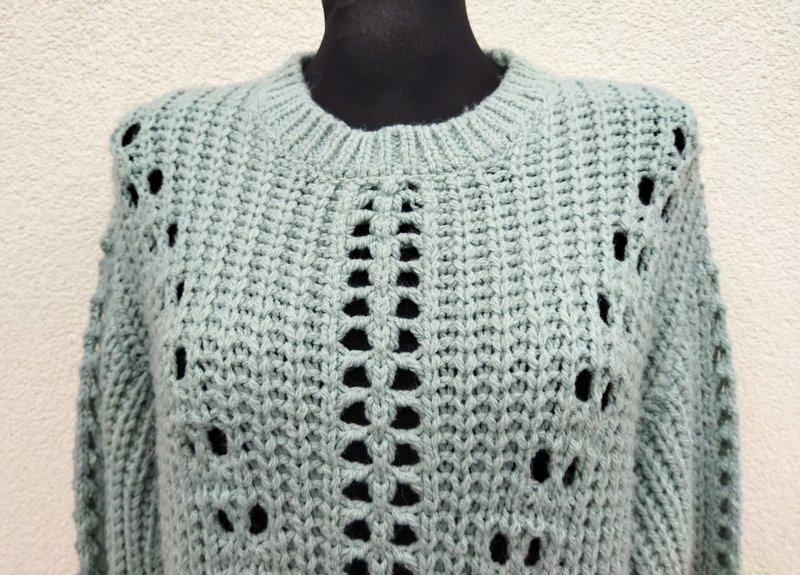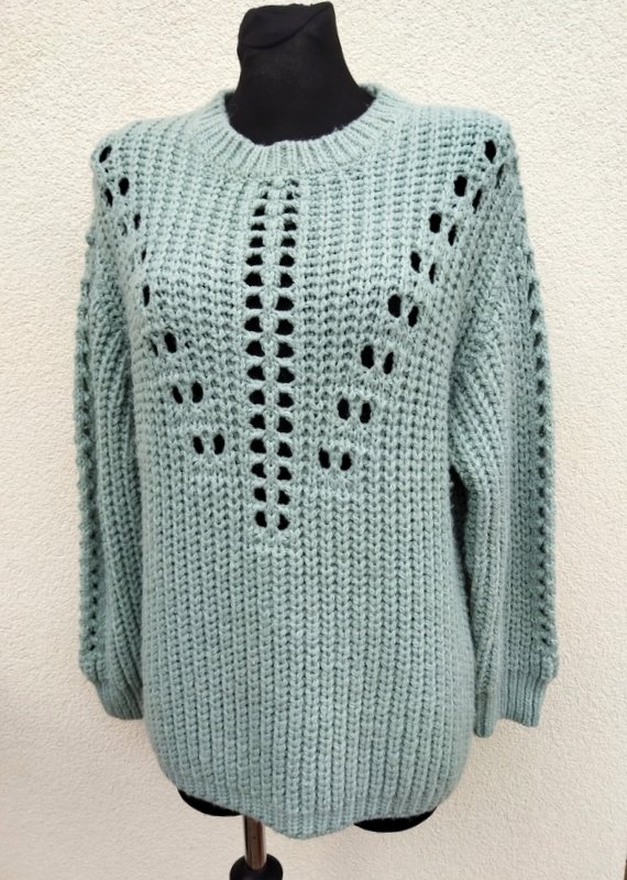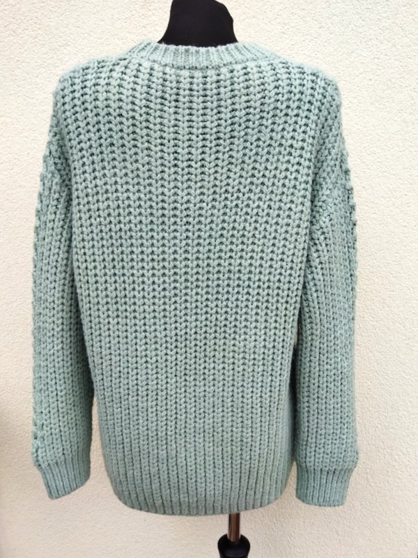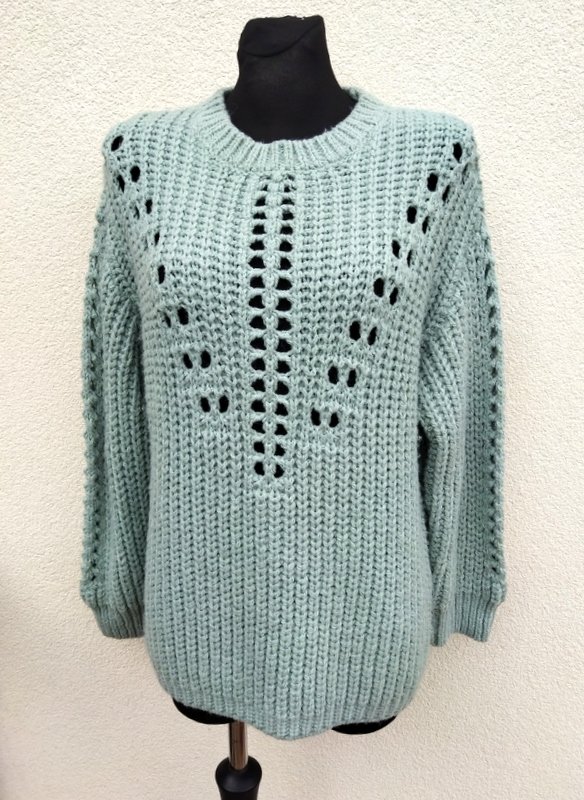 Miły, mięsisty ale miękki sweter z akrylowej włóczki w miętowym kolorze z miejscowo ażurowym wzorem . Wykończony ściągaczami.