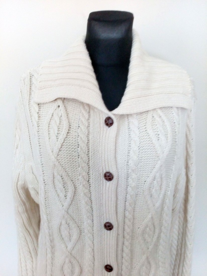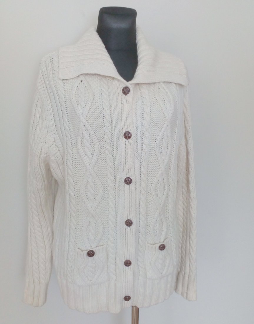 Wełniany sweter w kolorze ecru, z wyrabianym wzorem, u dołu przodu małe, naszywane kieszonki, ściągacz u dołu i przy rękawach