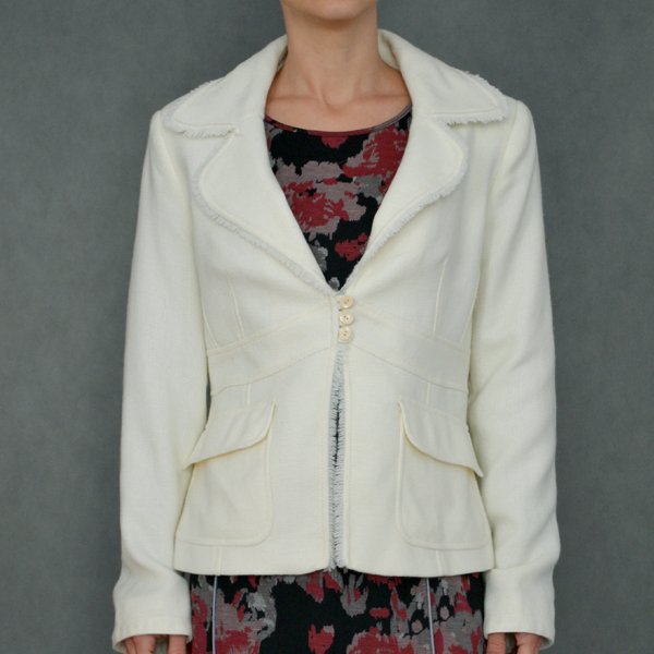 Przepiękny żakiet MANGO w kolorze pomiędzy bielą a ecru. W dużej mierze wykonany z wełny, o delikatnej fakturze. Brzegi wykończone delikatnym strzępieniem. Po bokach kieszonki. Talia odznaczona, zapinana na 3 guziczki. Ciepły i piękny.