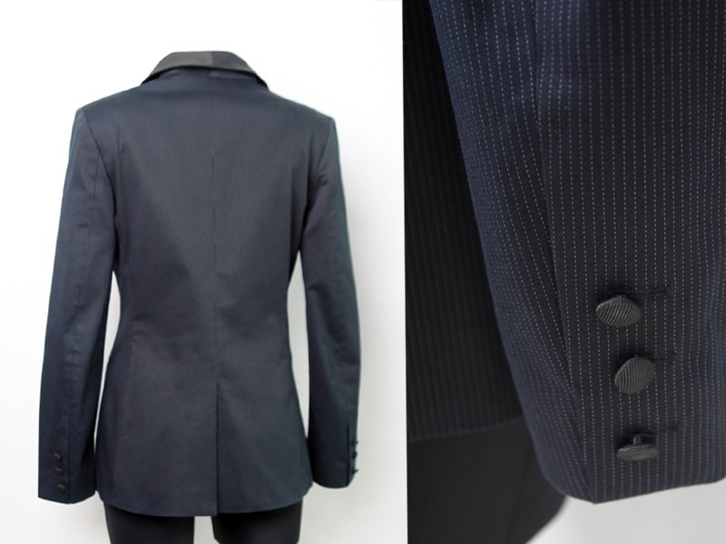 Elegancki żakiet na żakardowej podszewce, taliowany, zapinanany na guzik, z tyłu rozcięcie, kołnierz szalowy, posiada w sumie 3 kieszenie wpuszczane wykończone listewkami, rękawy długie wąskie. Kolor: granatowy w delikatny prążek.