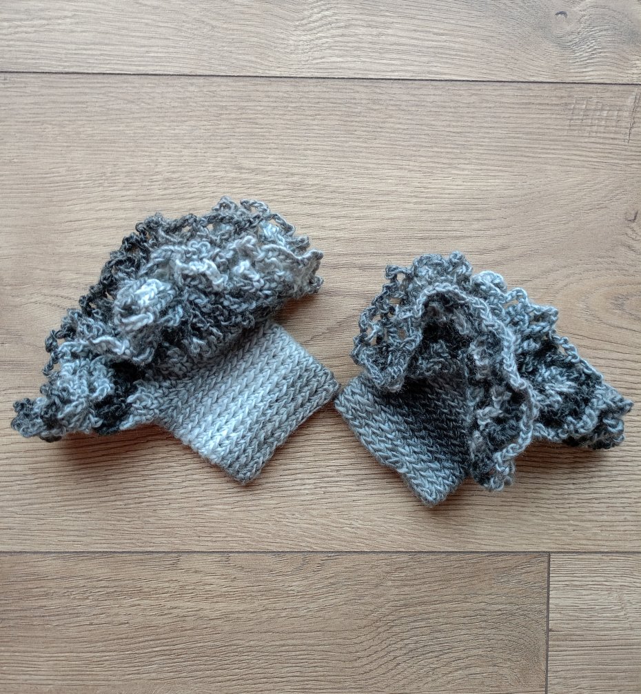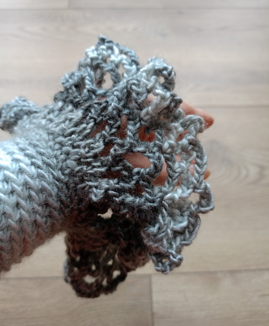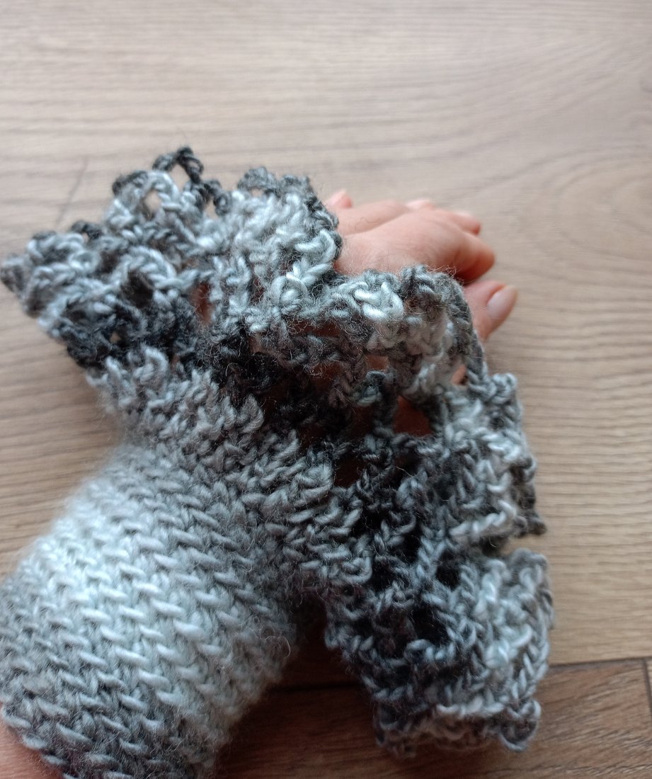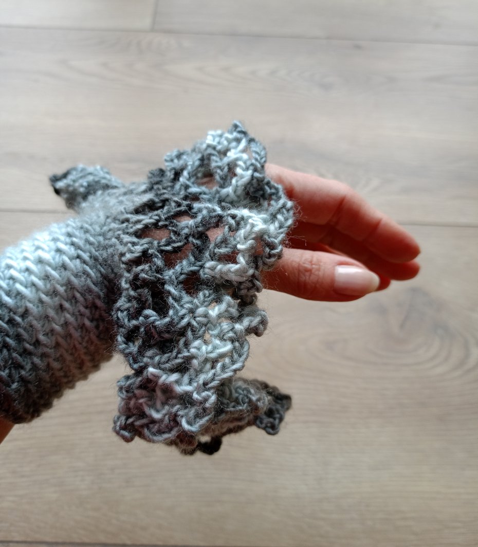 Efektowne oryginalne ażurowe rękawki - mankiety do swetra, cieniowane, w szarej kolorystyce,