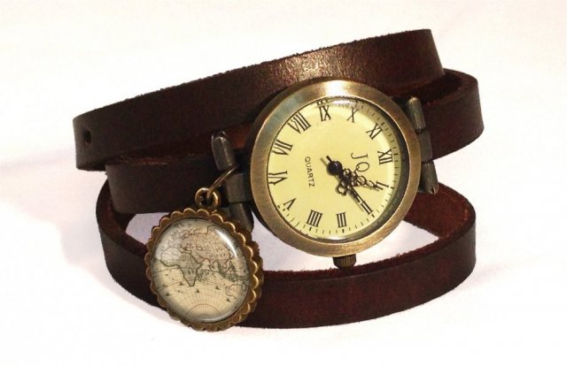 Zegarek ze skórzanym paskiem kilkakrotnie zakręcanym na ręku z ręcznie robioną zawieszką (kaboszonem).
