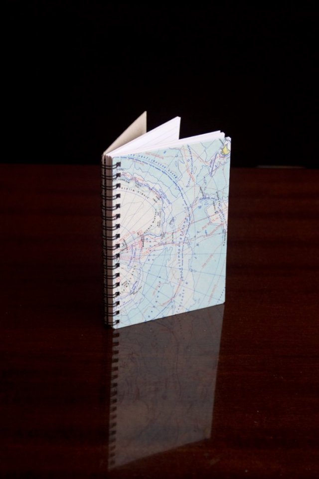 Spiralnie bindowany notes z okładką wyklejoną oldschoolową mapą.