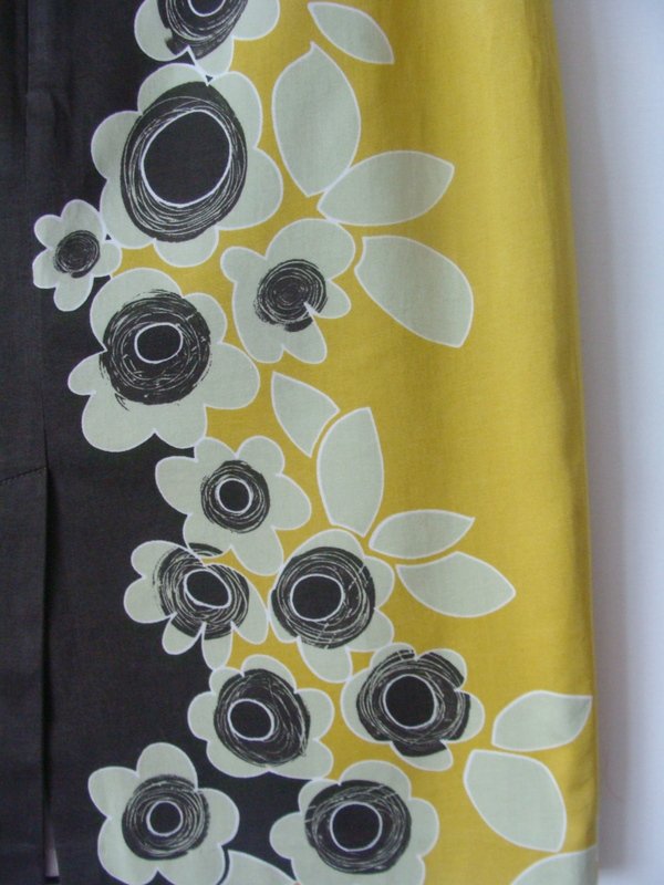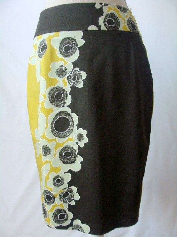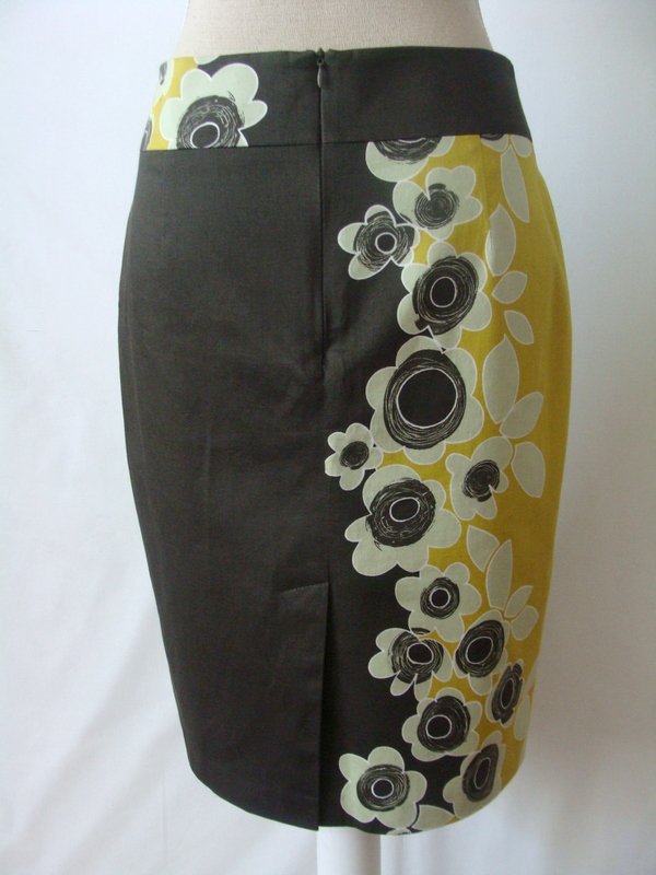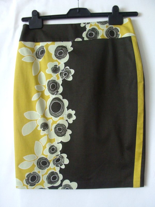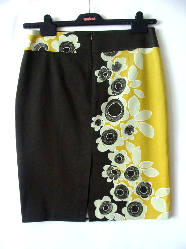 Ołówkowa , bawełniana spódnica w ładnej kombinacji kolorystycznej z wzorem kwiatowym z boku. Zapinana z tyłu na zamek , u dołu rozcięcie. Na podszewce.