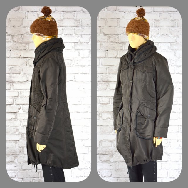 Dłuższa ciepła (na kożuszku ) kurtka marki Marc Cain -kolekcja sport. Kurtka o delikatnie poszerzanym kroju, w pasie od wew regulowana, na samym dole również można ściągnąć wtedy uzyskamy krój ala bombka.Kurtka z przodu po bokach pikowana, pikowana również z tyłu, posiada wysoki kołnierz.Liczne kieszenie- z przodu dwie u góry i dwie u dołu.Kurtka zasuwana na suwak i dodatkowo zapinana na guziki (wtedy suwaka nie widać).Kolor brązowy .
