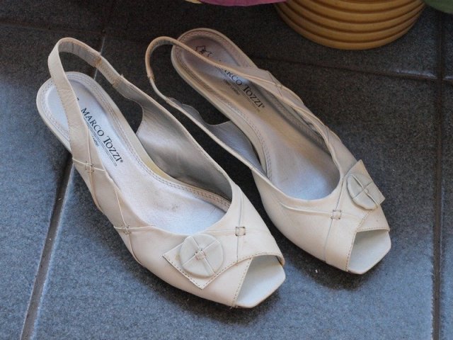 buty marki marco tozzi, z naturalnej skóry, w kolorze ecru. Rozmiar 38 długość wkładki do samego końca 24,5cm. chyba na szerszą stopę. Zgrabny obcas 4cm. Stan bardzo dobry jak na zdjęciach. kilka niewielkich śladów, chyba po kleju, praktycznie niewidocznych.