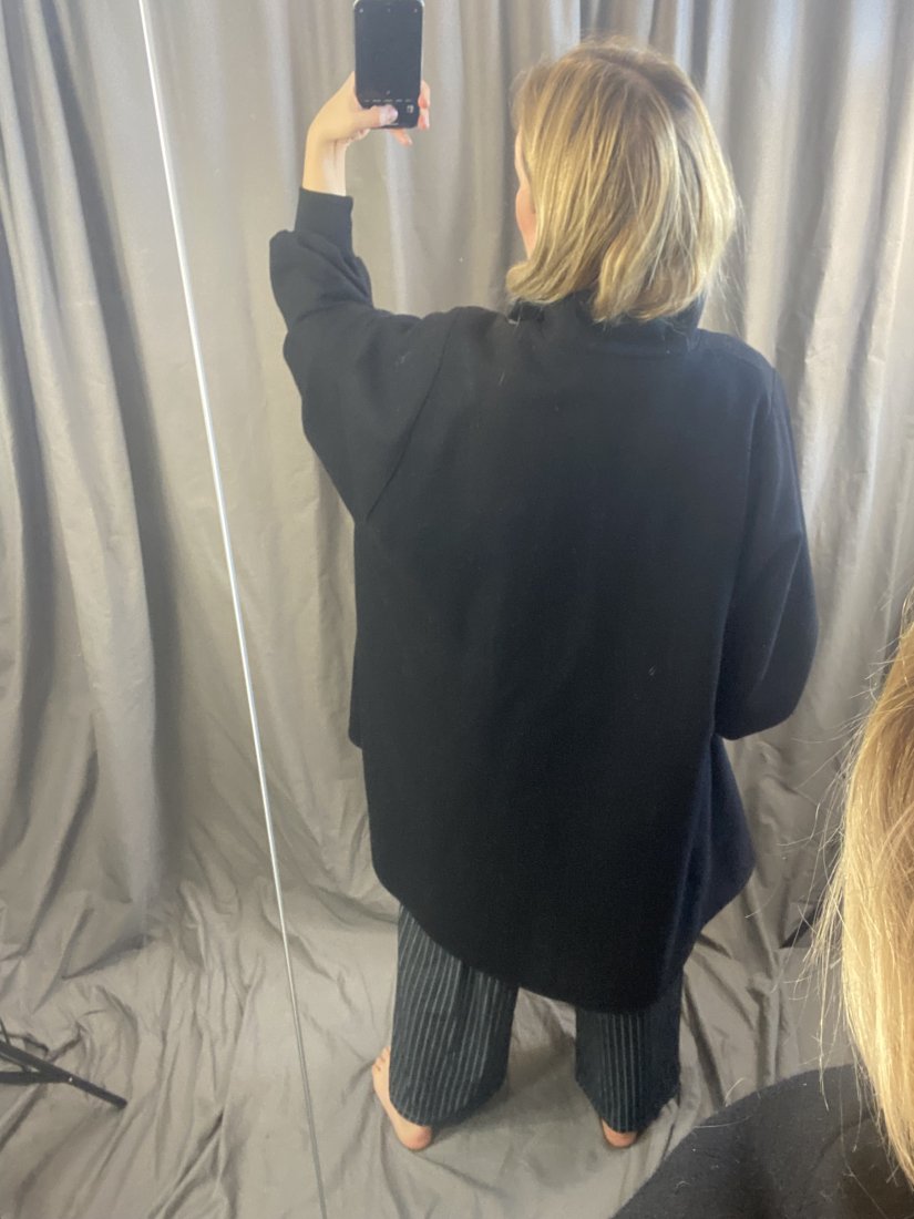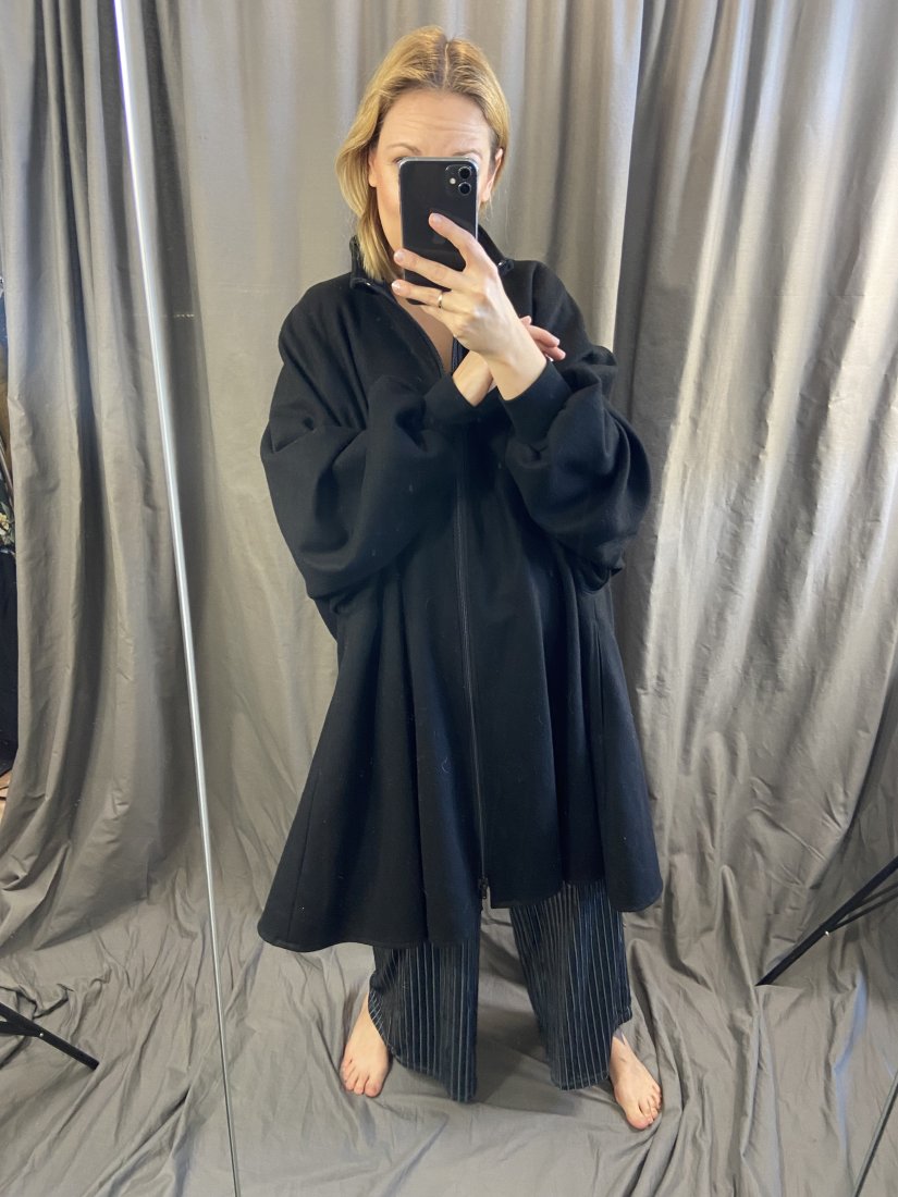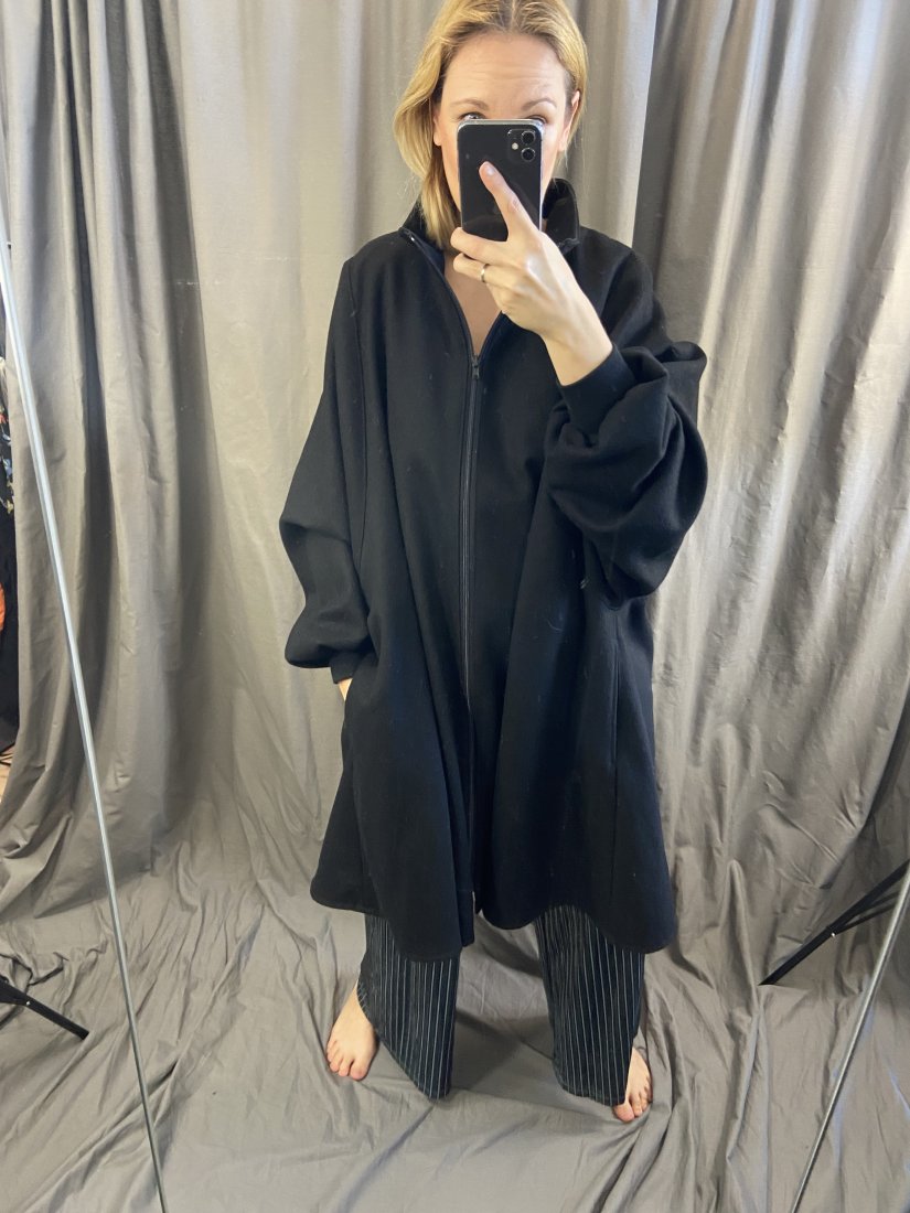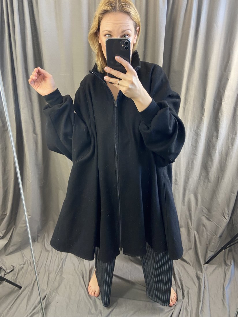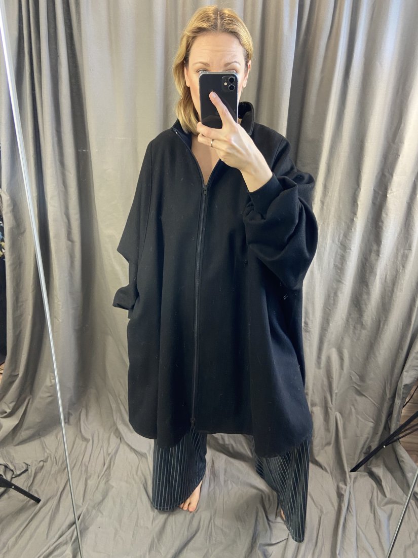 Wełniany płaszczyk oversize, na podszewce. Od projektantki Margarety Forslund. Świetny krój ponczowy, kieszenie w pasie. Wełna parzona.