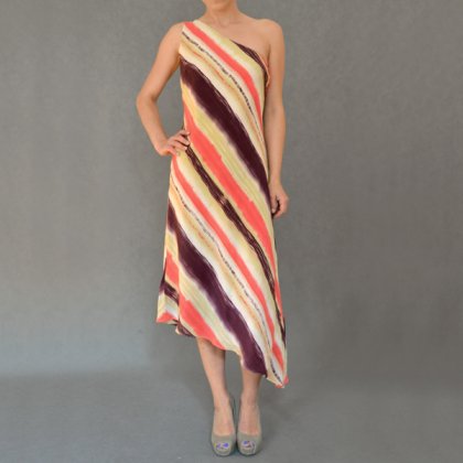 Jedwabna sukienka projektantki MARII GRACHVOGEL. Sukienka jest z serii DESIGNERS AT DEBENHAMS. Na jedno ramię, na dole również delikatnie asymetryczna. Kolory to oberżyna, koralowy, blada oliwka. Na podszewce. Polecam serdecznie. Kolory na zdjęciach mogą się troszkę różnić.